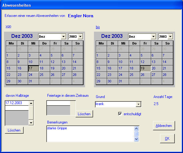 Einfachste Erfassung der Absenzen mit Berechnung der Abwesenheiten in Tagen und Halbtagen (mit automatischer Berücksichtigung des freien Mittwochnachmittages und eines allfälligen freien Halbtages in der jeweiligen Gruppe)