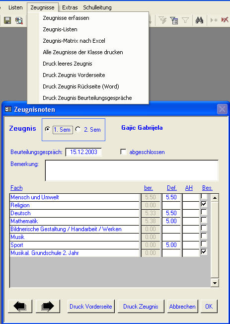 Möglichkeiten der Erfassung und des Ausdruckes für die Zeugnisse.